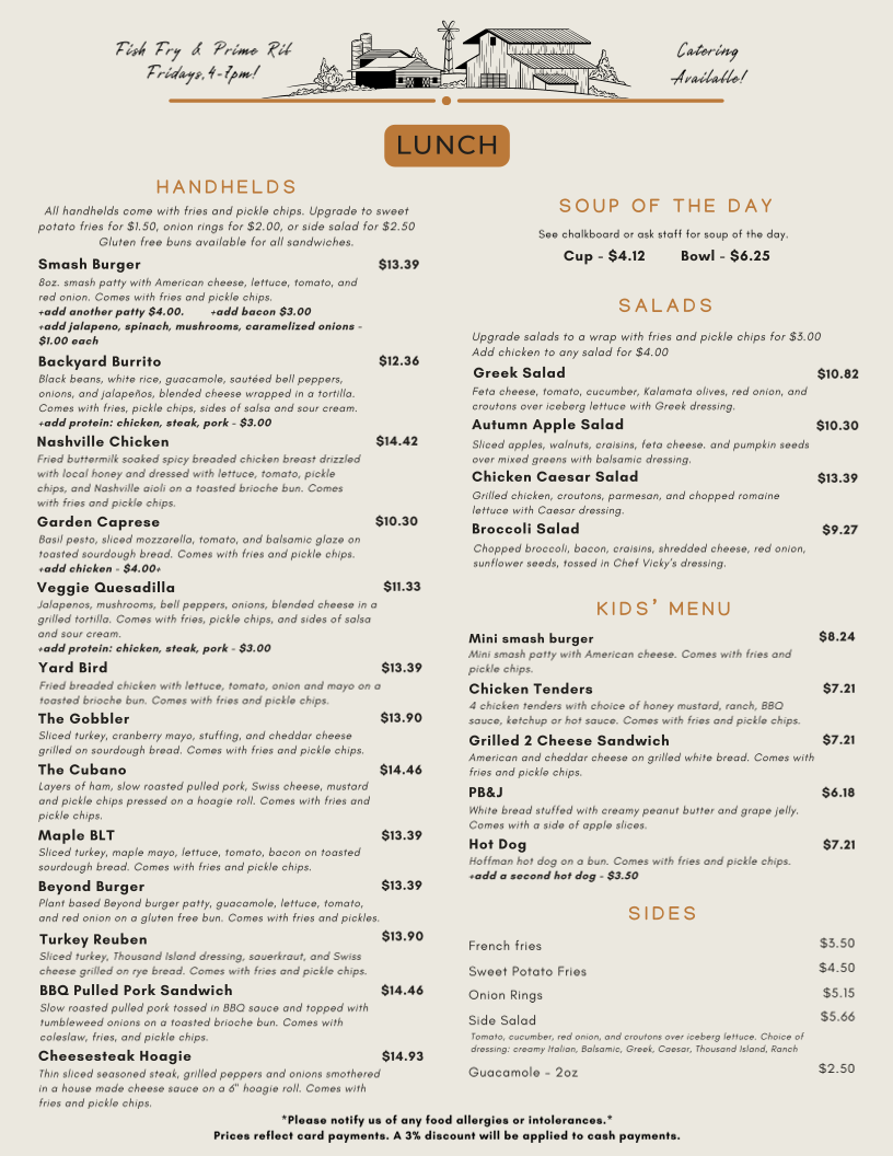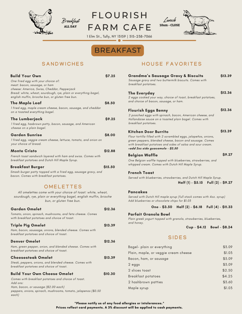 The Flourish Farm Cafe menu at 1 Elm St, Tully, NY, is a delightful mix of comfort food, fresh ingredients, and creative dishes that cater to all tastes. From hearty handhelds to light salads, each dish is thoughtfully crafted to offer something for everyone. For a savory bite, the Smash Burger and Nashville Chicken stand out, packed with flavor and the perfect balance of crispy and juicy. If you're in the mood for something with a bit more spice, the Backyard Burrito and Veggie Quesadilla are both vibrant options that bring a burst of flavors to the table. For a fresh and satisfying choice, the Garden Caprese is a delightful light handheld that’s ideal for a quick and healthy meal.