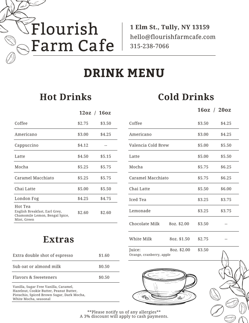 Finally, no meal is complete without a hot drink, and the cafe offers a range of options, including Coffee, Americano, Cappuccino, Latte, and Mocha. For those looking to add an extra kick to their coffee, the Extra Double Shot of Espresso is a great way to fuel your day. Whether you're stopping by for a quick bite or enjoying a leisurely meal, the Flourish Farm Cafe menu is full of delicious options to explore.